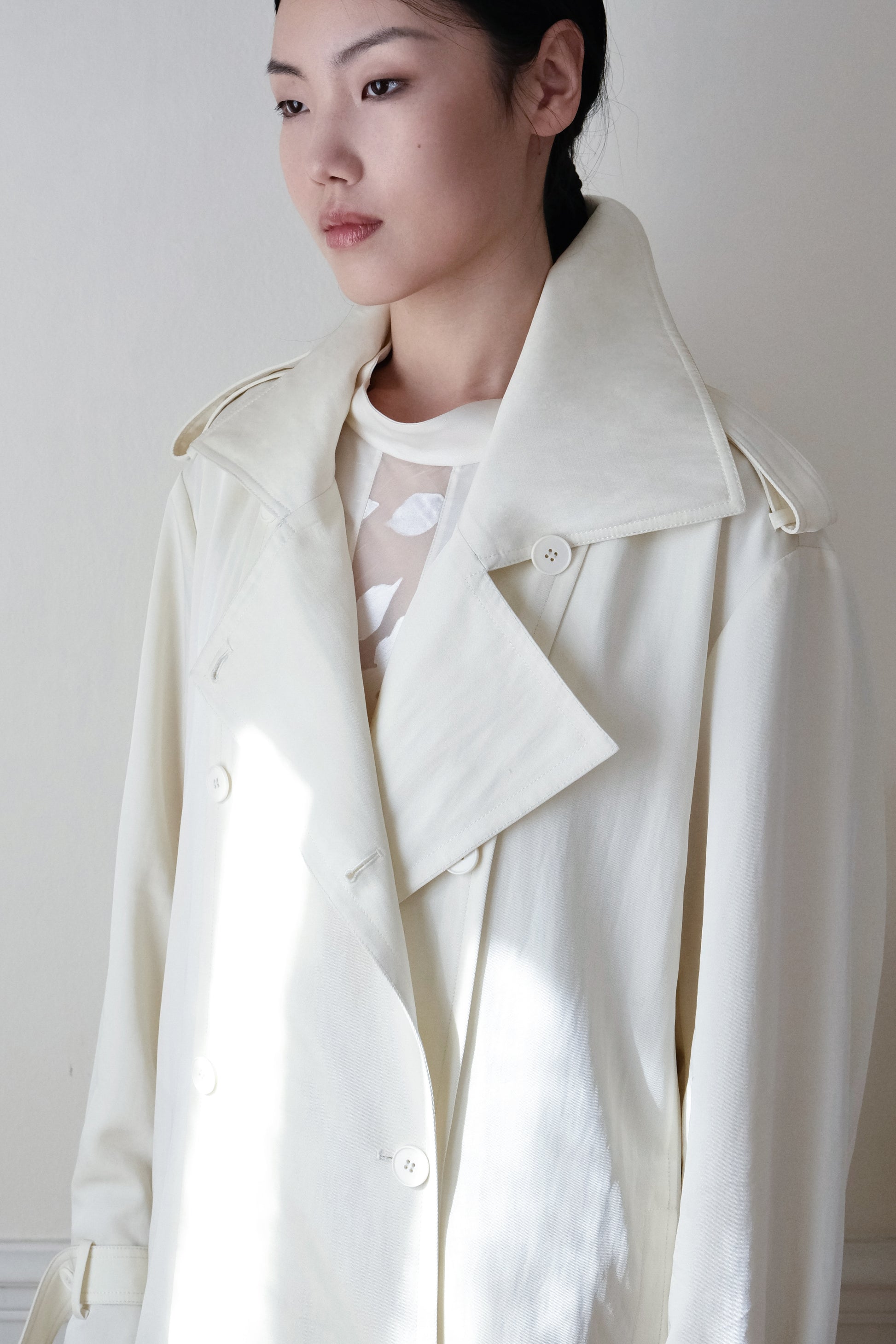 Trench-coat à large col montant avec boutons croisés. Le col montant est amovible pour un style relaxé. Avec bretelles, pattes de manche et fente haute au milieu du dos.