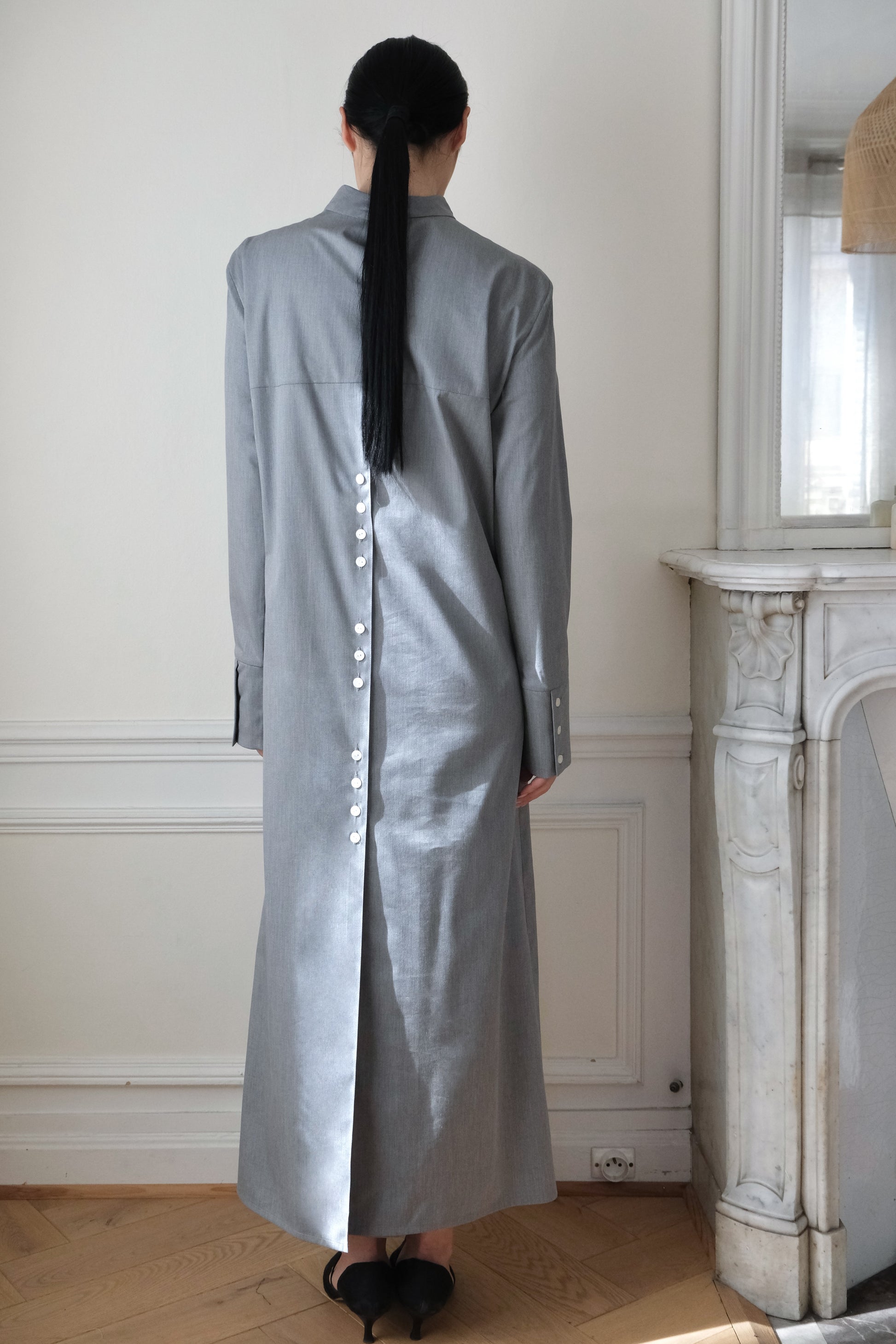 Calf-length A-line shirt dress with inverted pleats at the front and back. The uneven button design offers versatile styling choices.